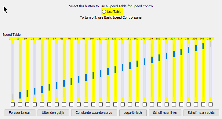 Wanneer met CV3, CV4, CV5 en CV6 niet het gewenste resultaat kan worden bereikt, dan kan men gebruiken maken van de rijstappentabel. Hier kan dan elke rijstap individueel worden vastgelegd, of zelfs middels een bepaalde kromme. Logaritmisch positief of logaritmisch negatief is zelfs mogelijk. Dit zijn de CV’s 67 tot en met 94. Dit is nagenoeg bij elke fabrikant dezelfde reeks CV’s.